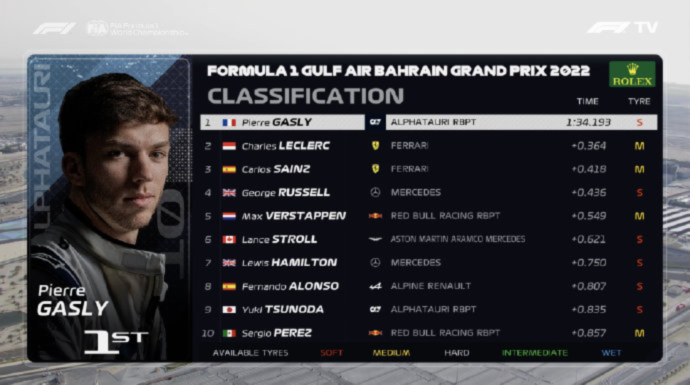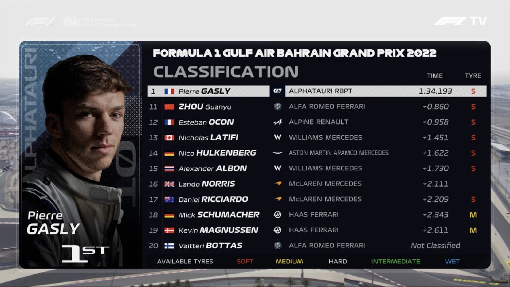 由于刚刚在上周进行过冬季测试,车手和车队们对巴林赛道并不陌生。最终,加斯利以1:34.193的成绩排在第一。