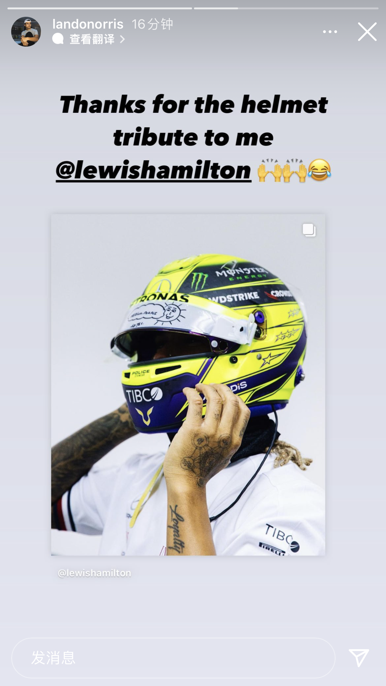 汉密尔顿新头盔换颜色,诺里斯:谢谢你的致敬