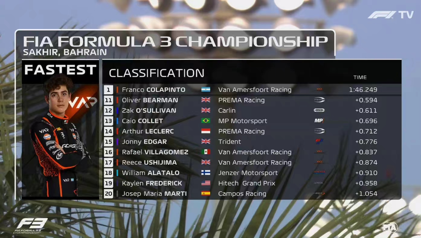 F3巴林站首轮排位赛结束,克拉品图首秀夺杆