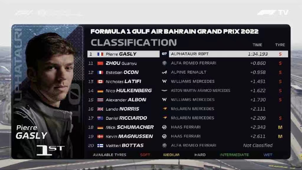 周冠宇一练排名第11,成绩落后第一名的加斯利0.860秒;