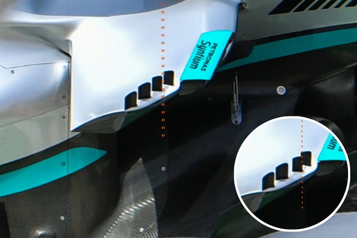 但在新规则下,原有的设计思路不再奏效。新规要求所有上部侧向防撞梁必须比原有位置高出至少50毫米。因此梅赛德斯将其防撞梁安置在规则箱上边缘附近,使其能够作为车身的气流调节器,同时使其不会约束侧箱进气道设计。