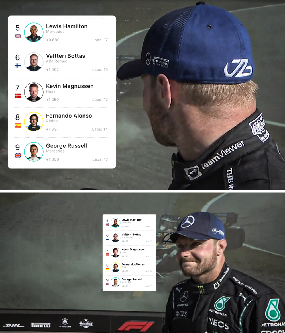 巴林站排位赛结束,汉密尔顿排名第五,博塔斯排名第六,不知道此时此刻几位当事人心里在想什么。