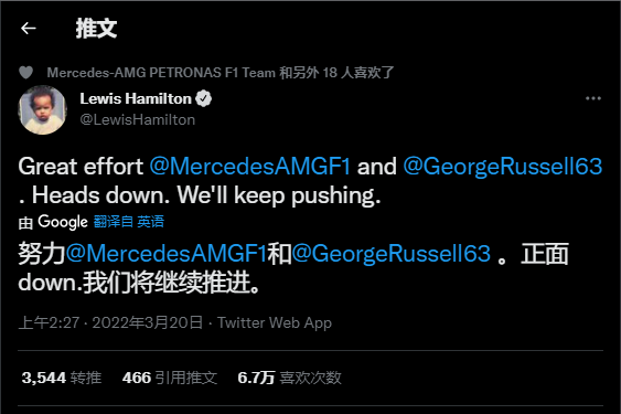 在巴林大奖赛排位赛过后,梅赛德斯的两位车手汉密尔顿和拉塞尔分据第5和第9。汉密尔顿在赛后更新推特表示:我们将继续前进。