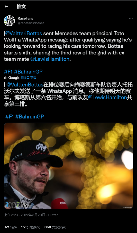 据Racefans推特,博塔斯在昨天排位赛结束后给梅赛德斯领队托托·沃尔夫发去了消息,称期待明天的比赛。