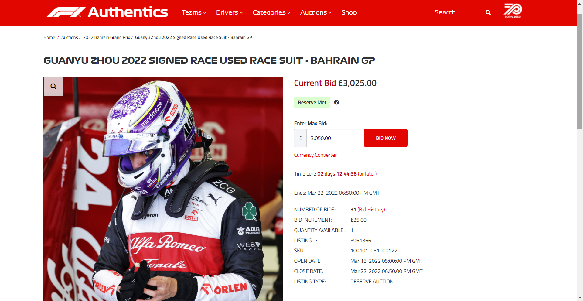 周冠宇生涯第一场F1比赛的落场赛车服正在被拍卖,截至目前最高出价已经到达3050磅。