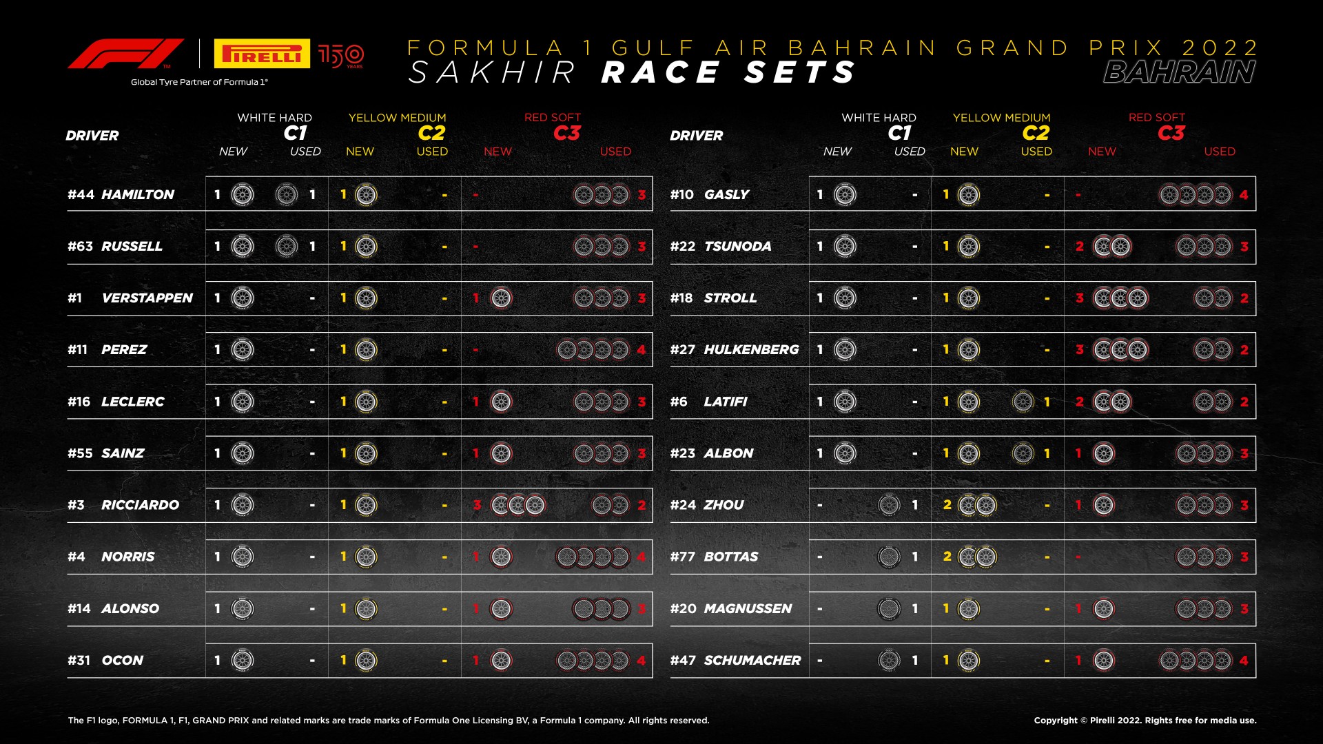 倍耐力公布了揭幕战各位车手轮胎剩余情况,其中梅赛德斯两位车手已经没有全新的软胎。