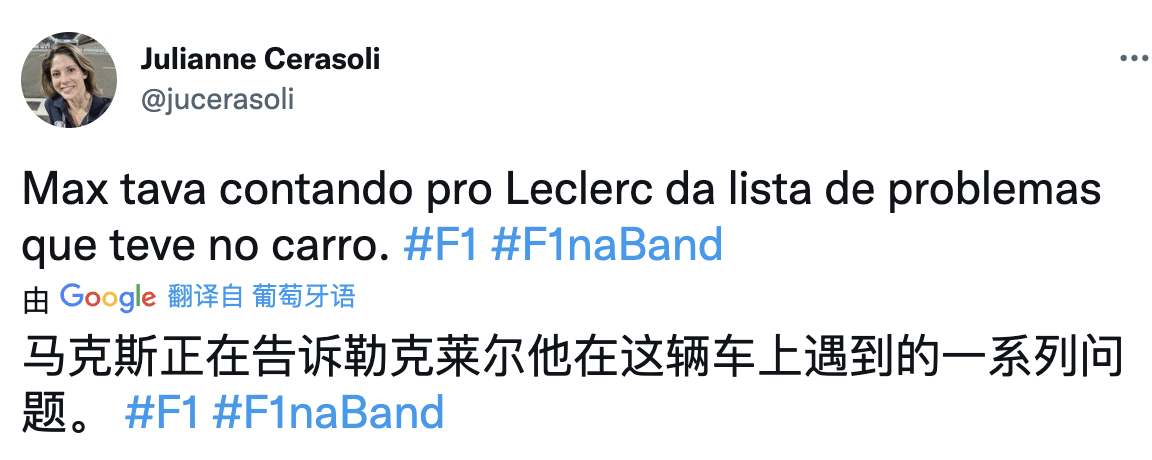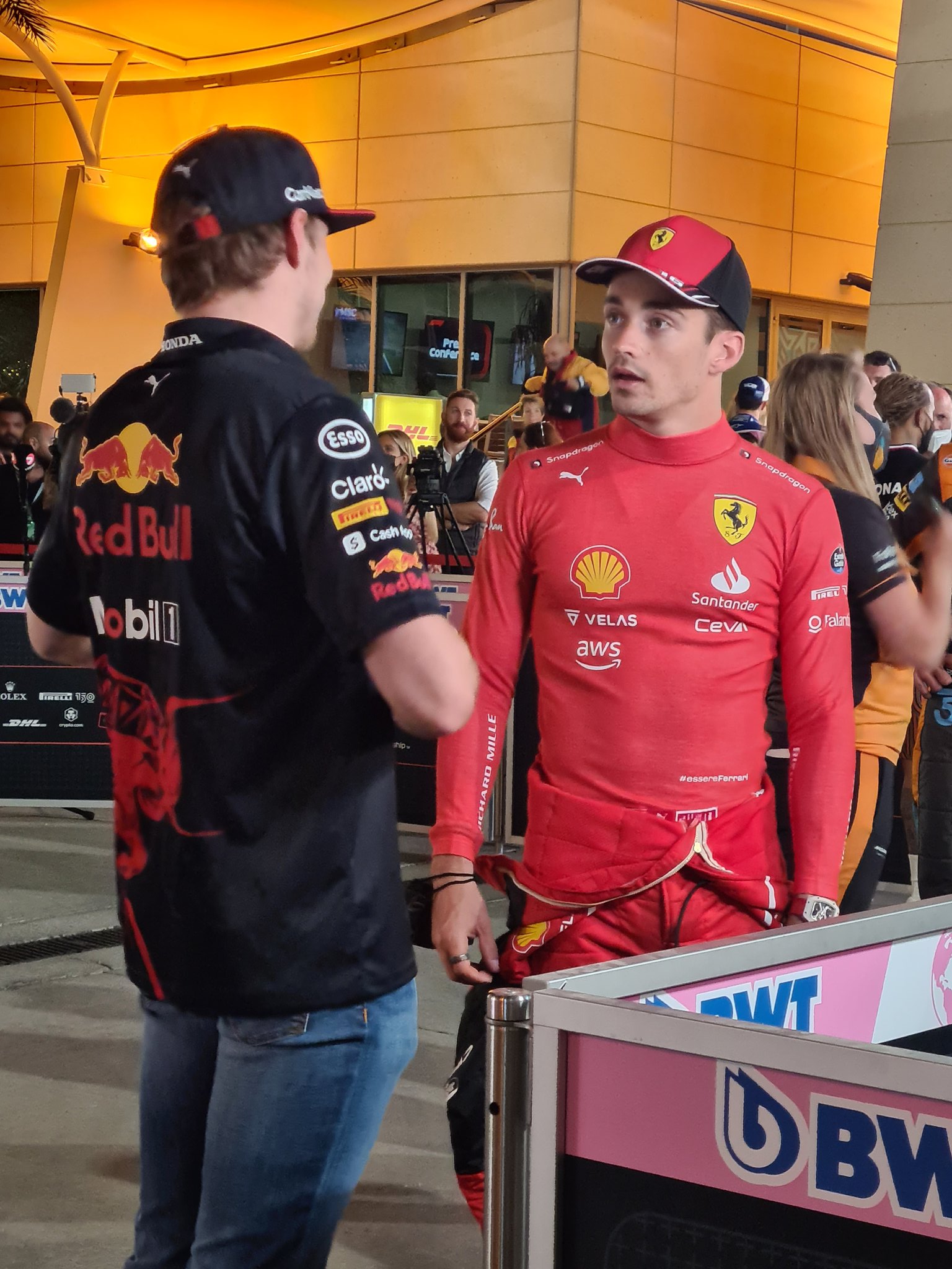 F1记者Julianne Cerasoli看到,赛后维斯塔潘正在向勒克莱尔讲述自己的赛车遇到的一系列问题。