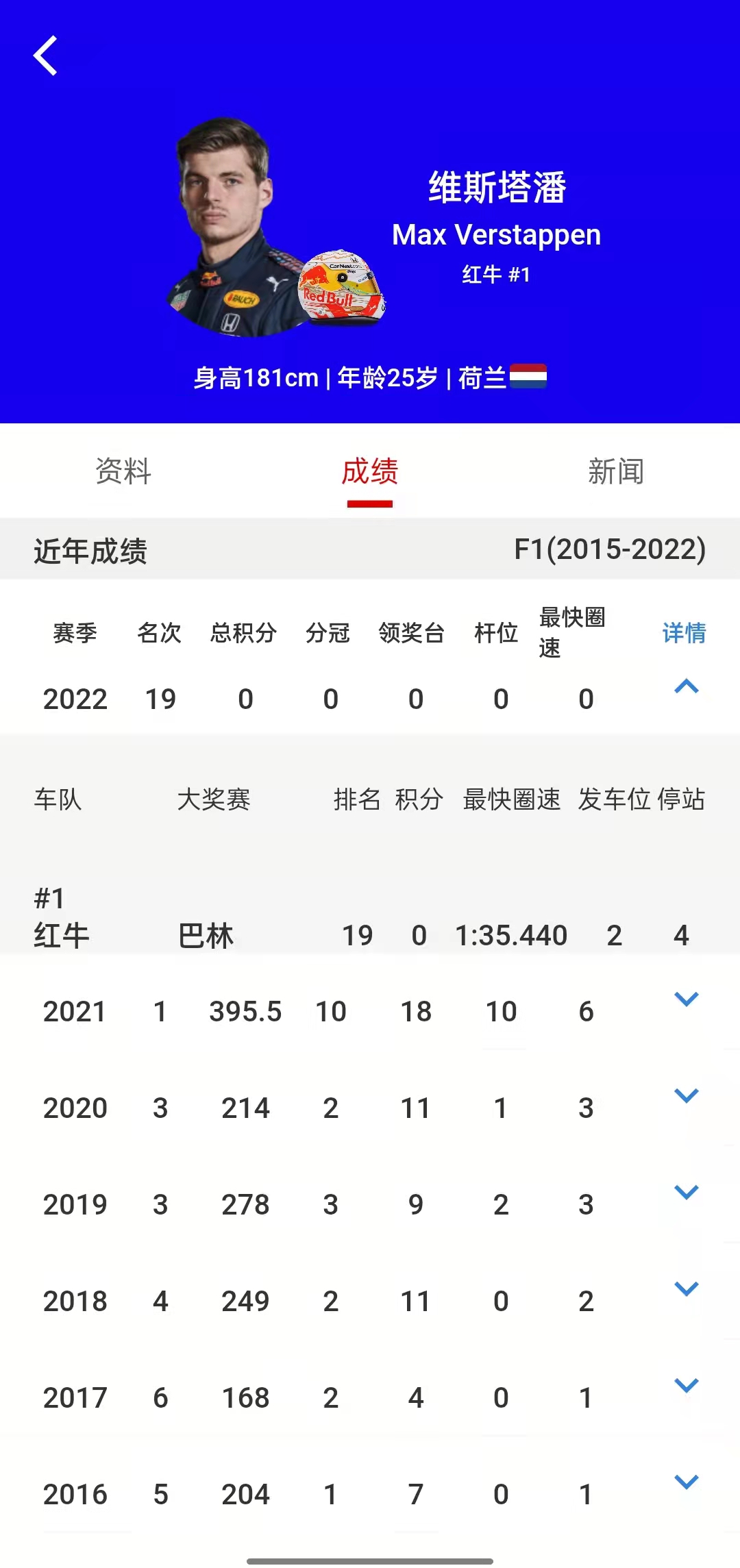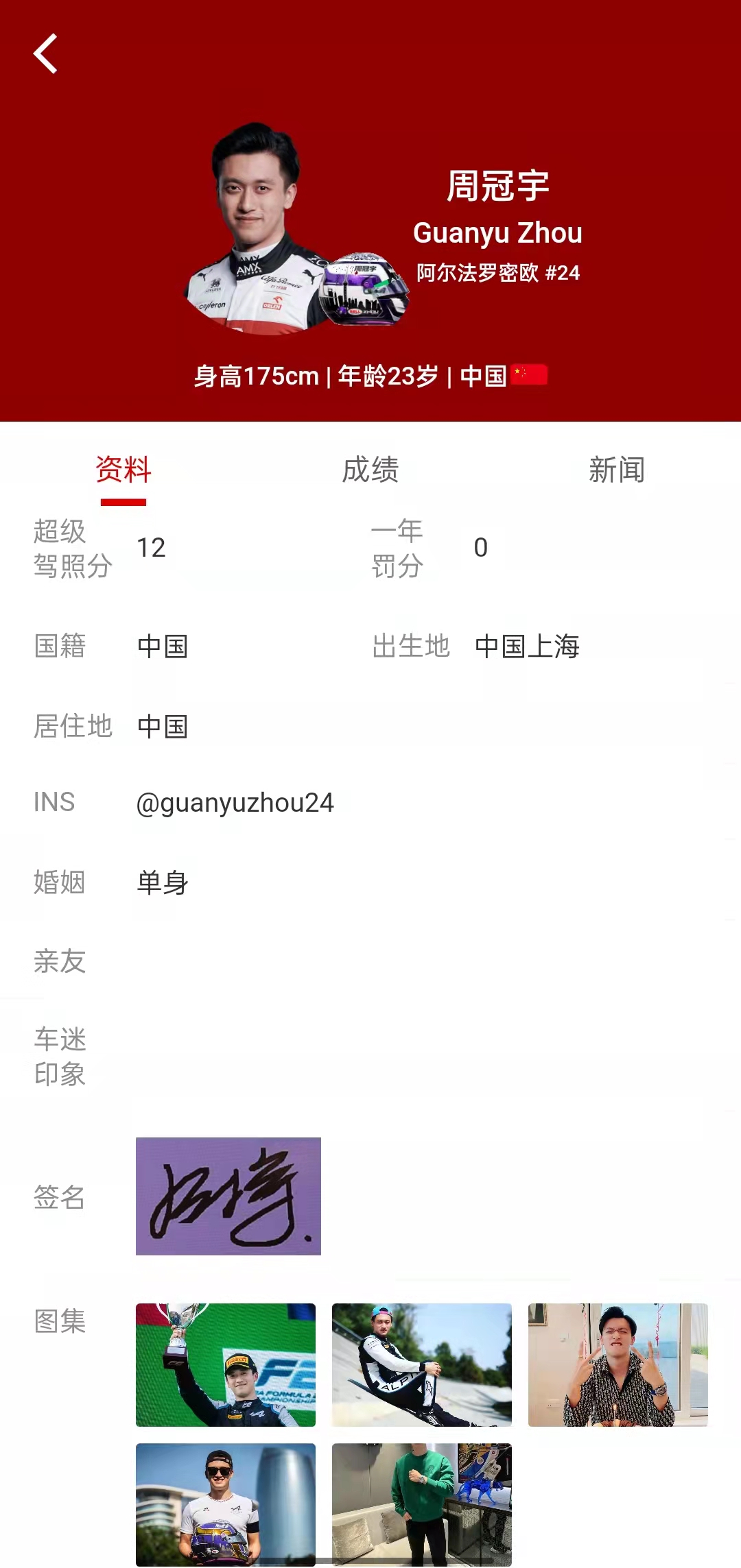 点开车手页,也有车手的基本资料(有车手的签名)和成绩。