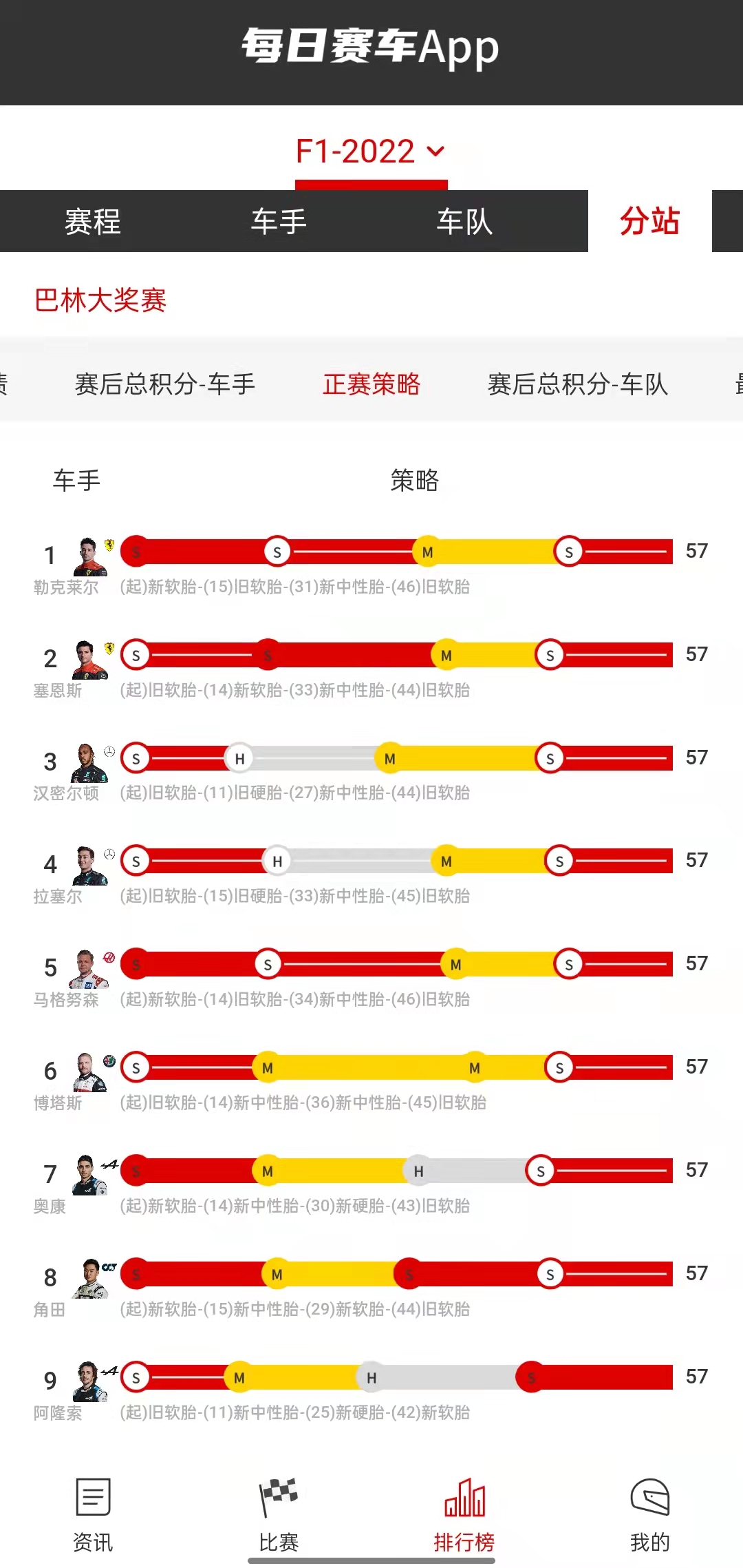 巴林站结束了亢奋的情绪之后,朋友可以点开APP最下端的“排行榜”,看看F1更多更详细的数据。