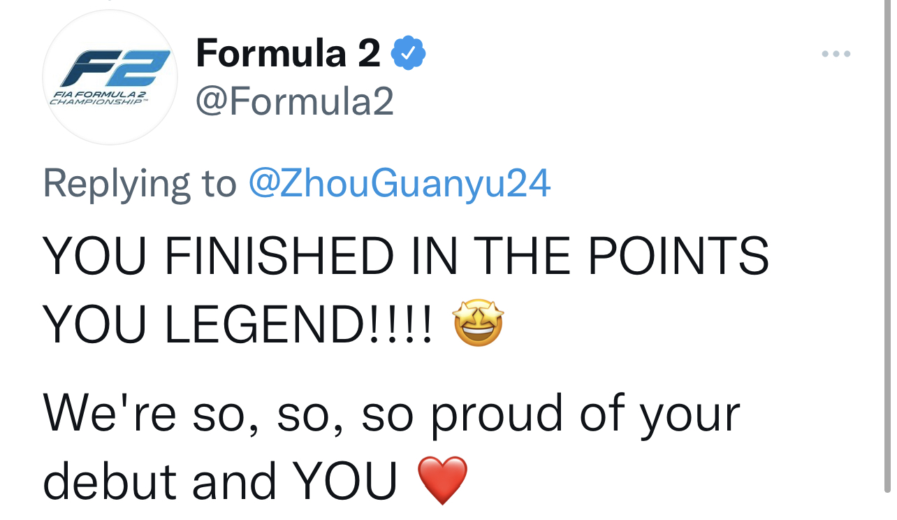 F2官方社交账号也前来祝贺:“你取得了积分,太棒了!我们太替你自豪了!”