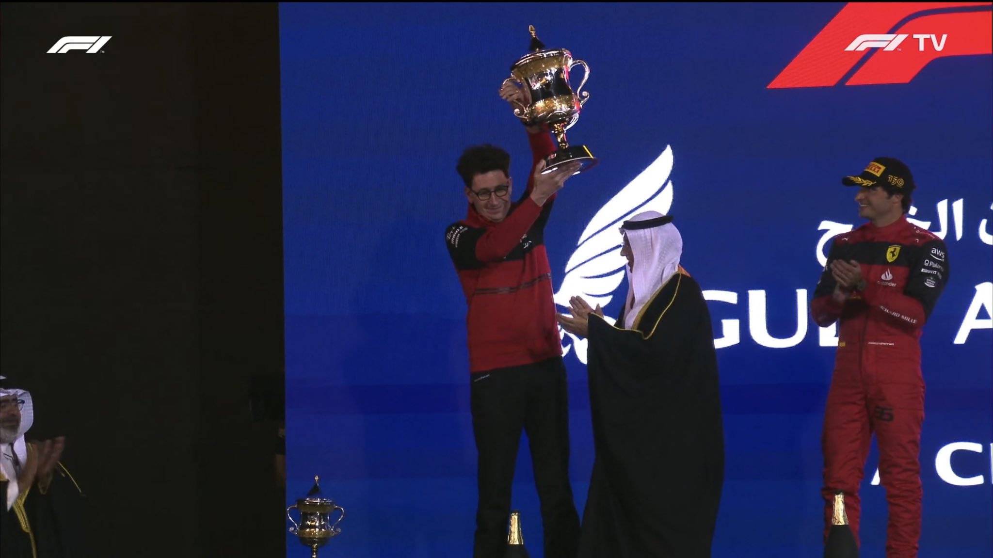 在维斯塔潘赛车故障退赛后,勒克莱尔确保了第一的位置,而塞恩斯也成功上到了第二名。法拉利车队领队比诺托在赛后激动不已,他亲自登上领奖台领取了车队奖杯。