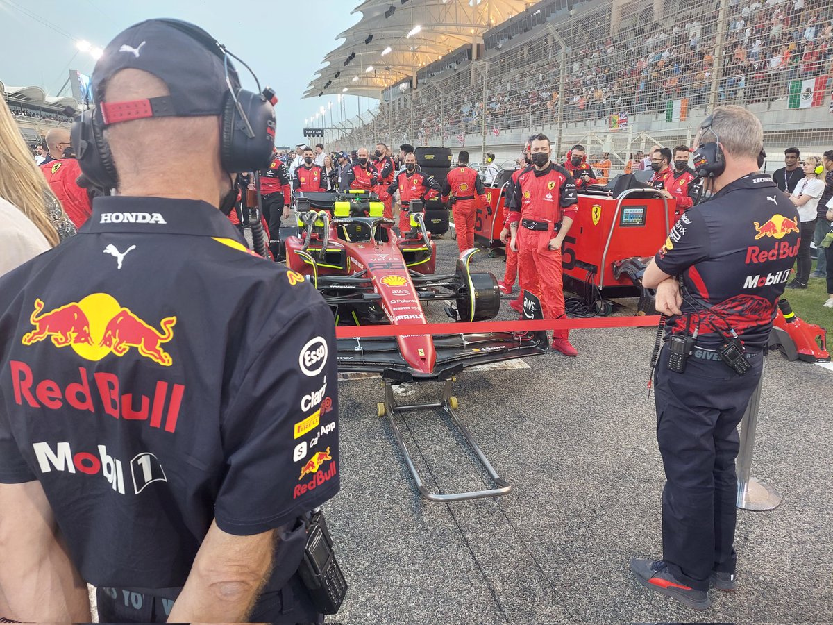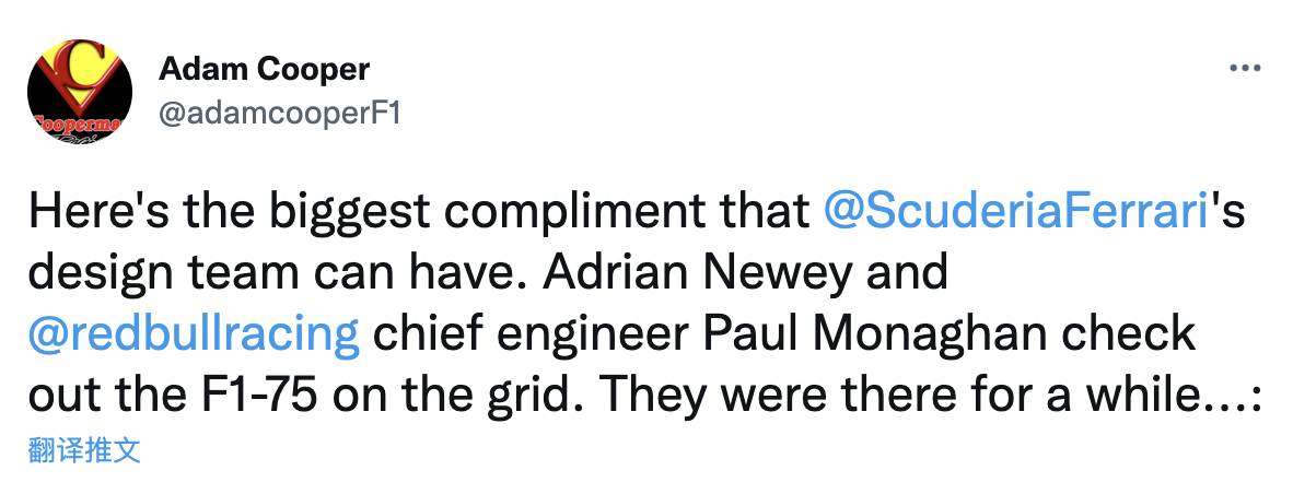 F1记者Adam Cooper发布了一张照片,图片中是红牛首席技术官纽维和首席工程师莫纳汉在发车格观摩法拉利F1-75赛车。Cooper表示,两个人在这里观察了好一会儿。