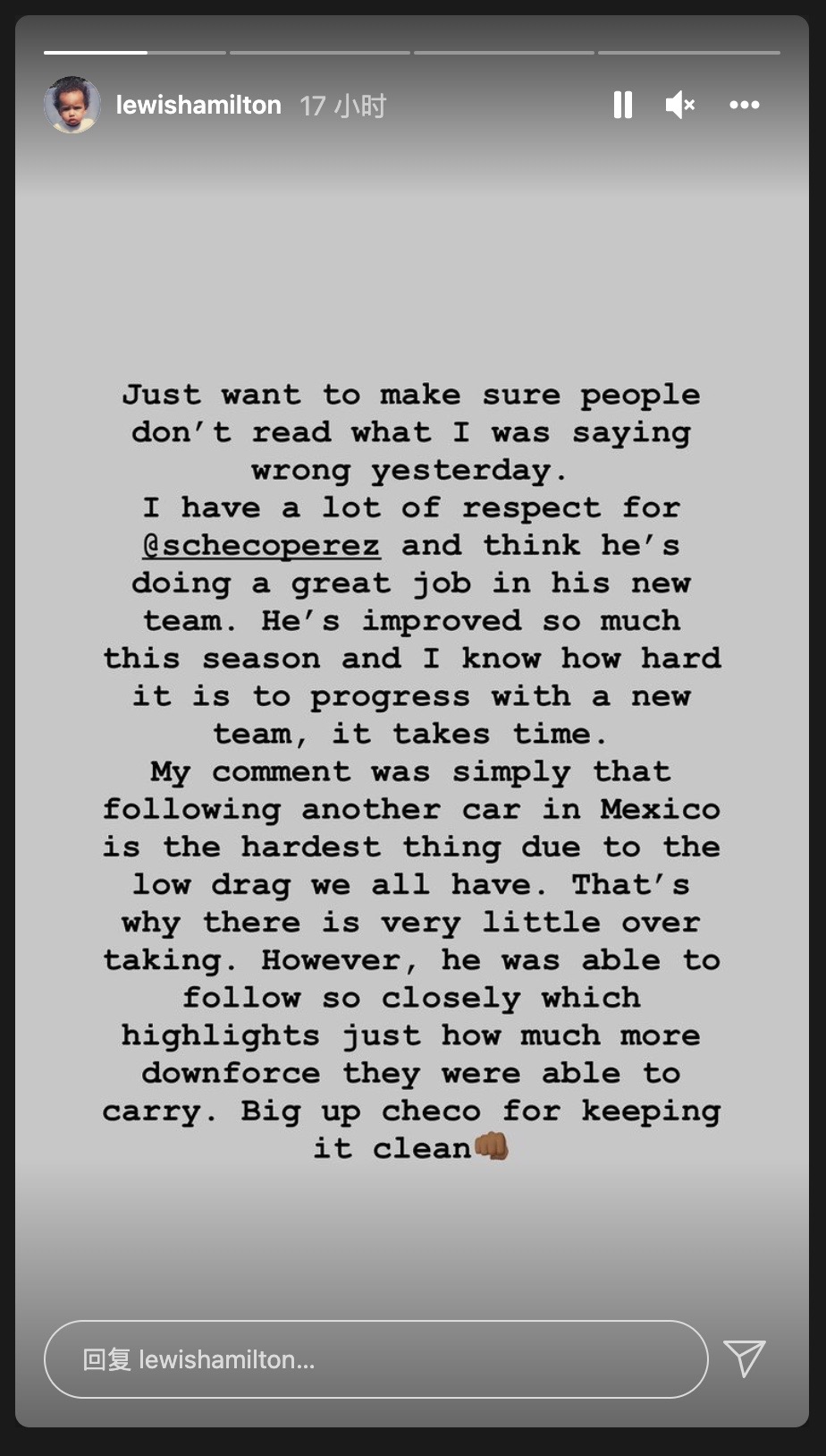 对此,汉密尔顿在Instagram写道:“不想让大家曲解我的意思。我对佩雷兹非常尊重,我认为他在新车队里表现很好。大家都知道适应新车有多难,需要很多时间,然而这个赛季以来他的进步非常明显。我昨天的意思是,这条赛道上阻力很小,导致跟车很难,所以超车也很难。但佩雷兹能够紧跟我那么多圈,这足以证明红牛的下压力有多强。感谢来自于Checo的公平竞争!”