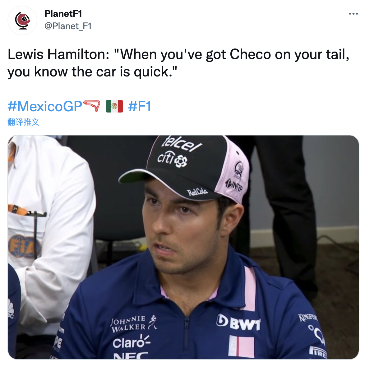 汉密尔顿这段解释,似乎依然是在说佩雷斯能跟上他的速度非常难得,而且还是因为红牛的车好?