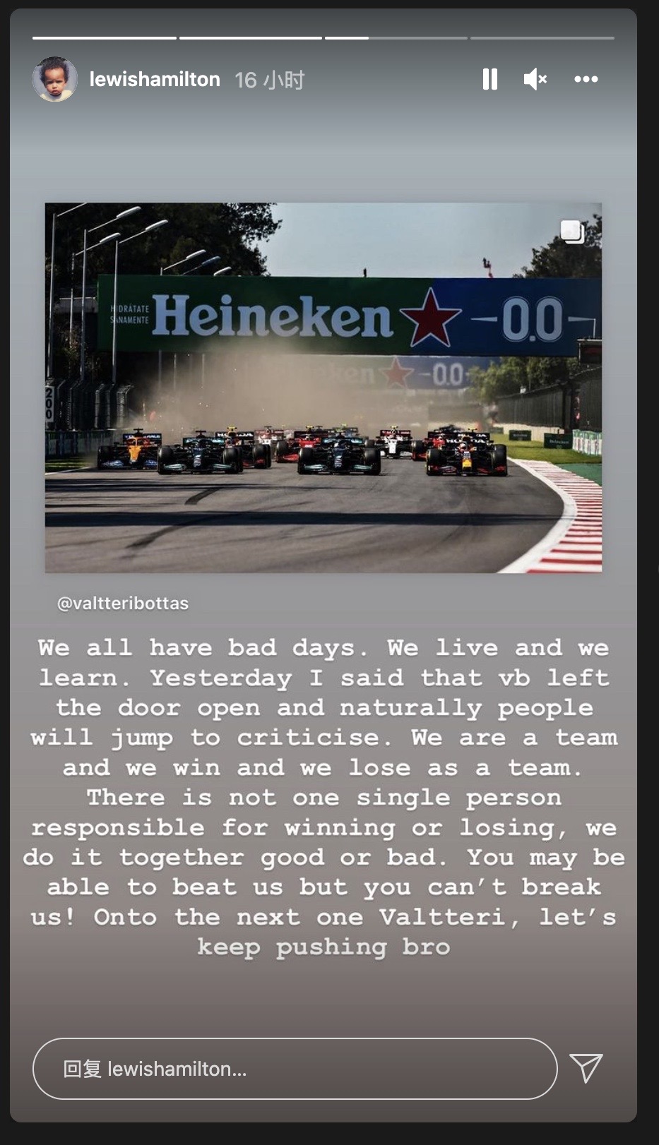 每次大奖赛结束,汉密尔顿都会在个人社交媒体Instagram的限时动态中发表长文,对自己的行为或言论做出解释,作为汉密尔顿的专属“保留节目”,这已经成为了F1圈的一个梗。墨西哥城大奖赛结束后,汉密尔顿对博塔斯和佩雷兹的评价引起了网友的不满。
