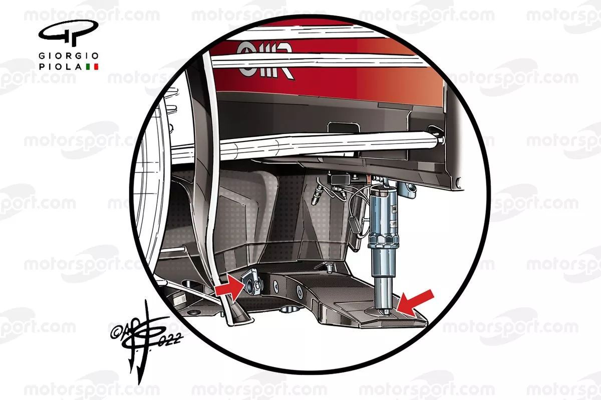 有趣的是,本赛季有几支车队在底盘和围板(赛车前部分流器下方底板)之间引入了弹簧装置,以帮助其在与赛道碰撞时保持稳定。这也有助于减少此块区域的磨损。