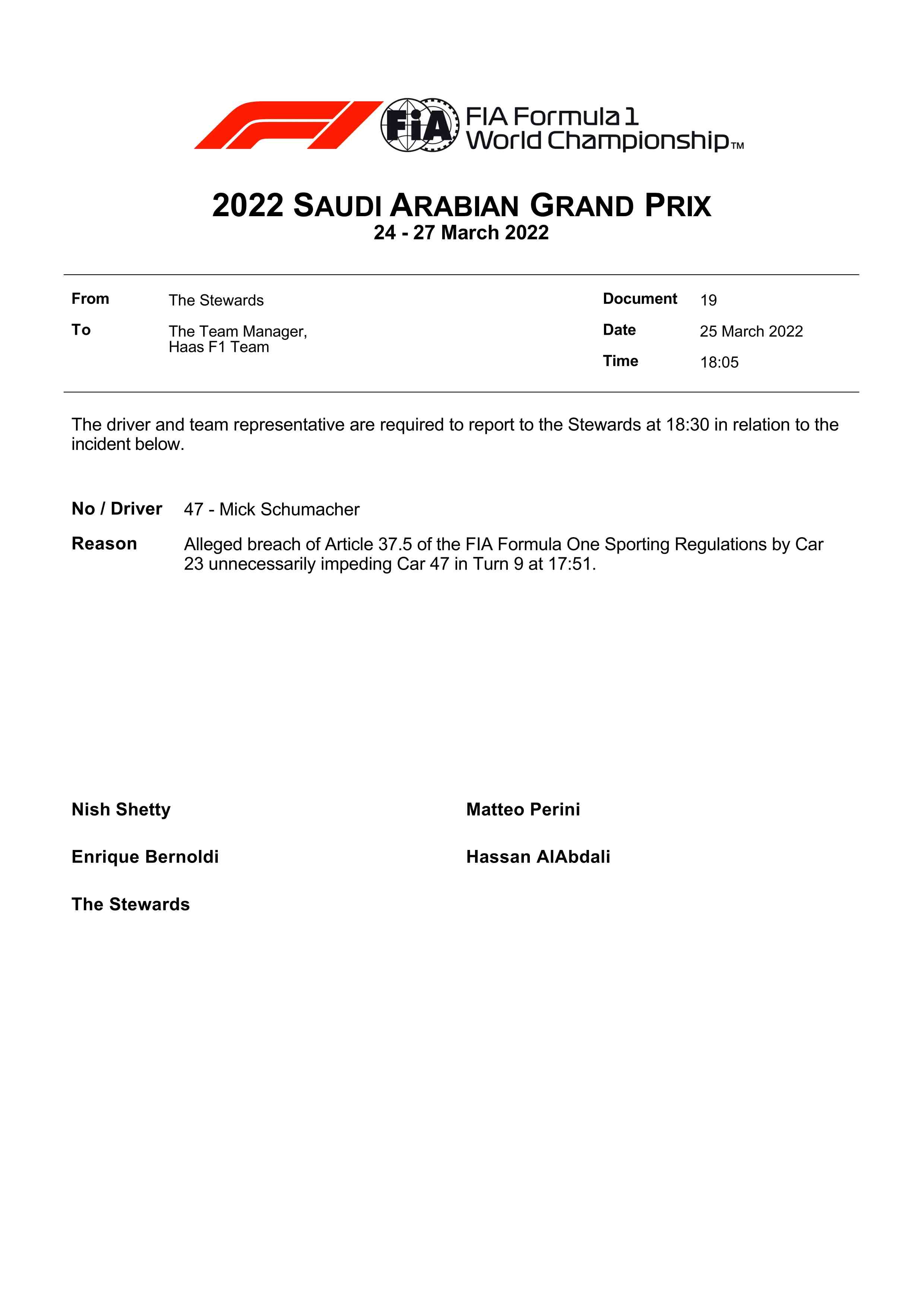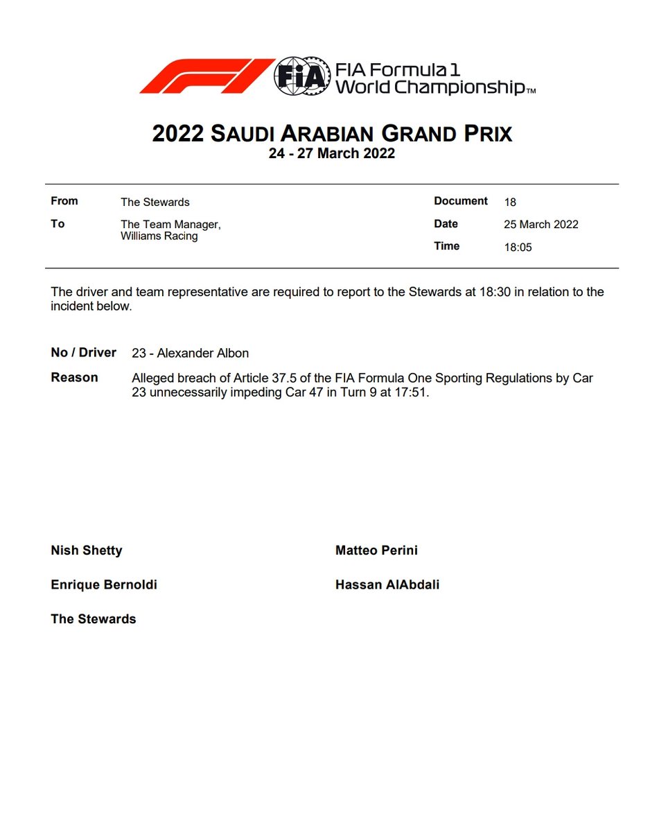 FIA发出通知,由于阿尔本在非必要情况下阻挡舒马赫,两位车手和车队代表被赛会干事传唤。