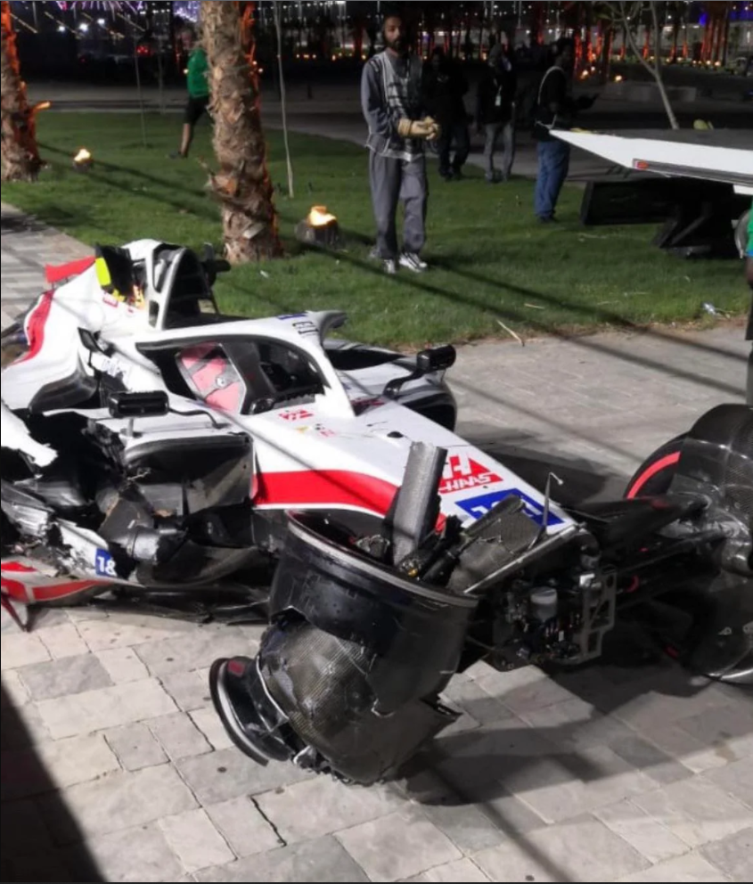 据Reddit网友发帖,他分享了沙特阿拉伯围场内马修分享给他的米克·舒马赫被撞毁赛车的照片。