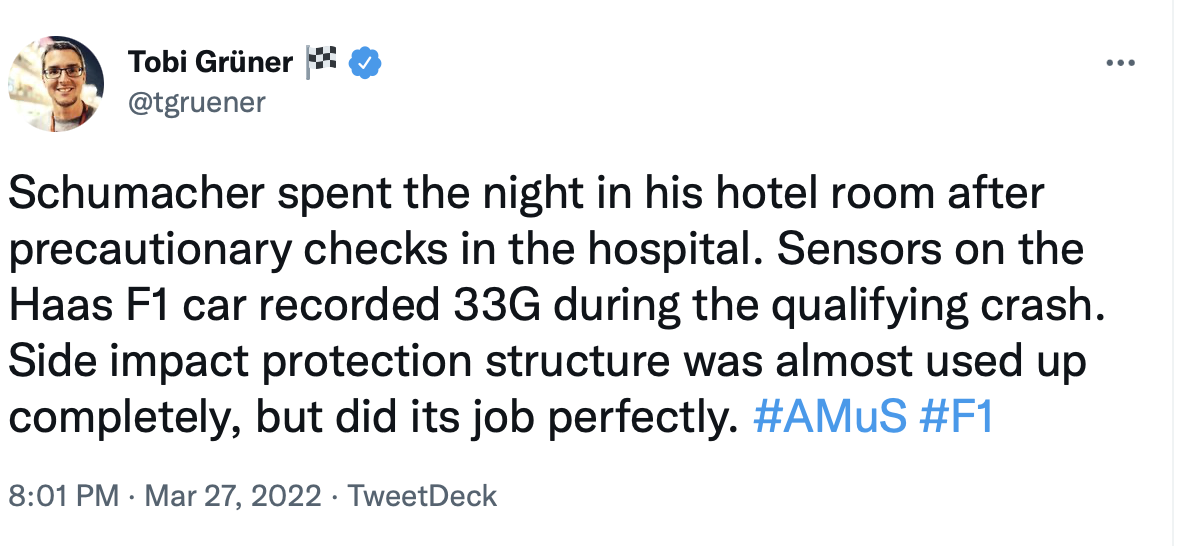 据F1记者所说,哈斯赛车传感器纪录到舒马赫排位赛撞击瞬间产生了33G的力量,侧向撞击的保护装置被用到极致,但成功起到保护作用。