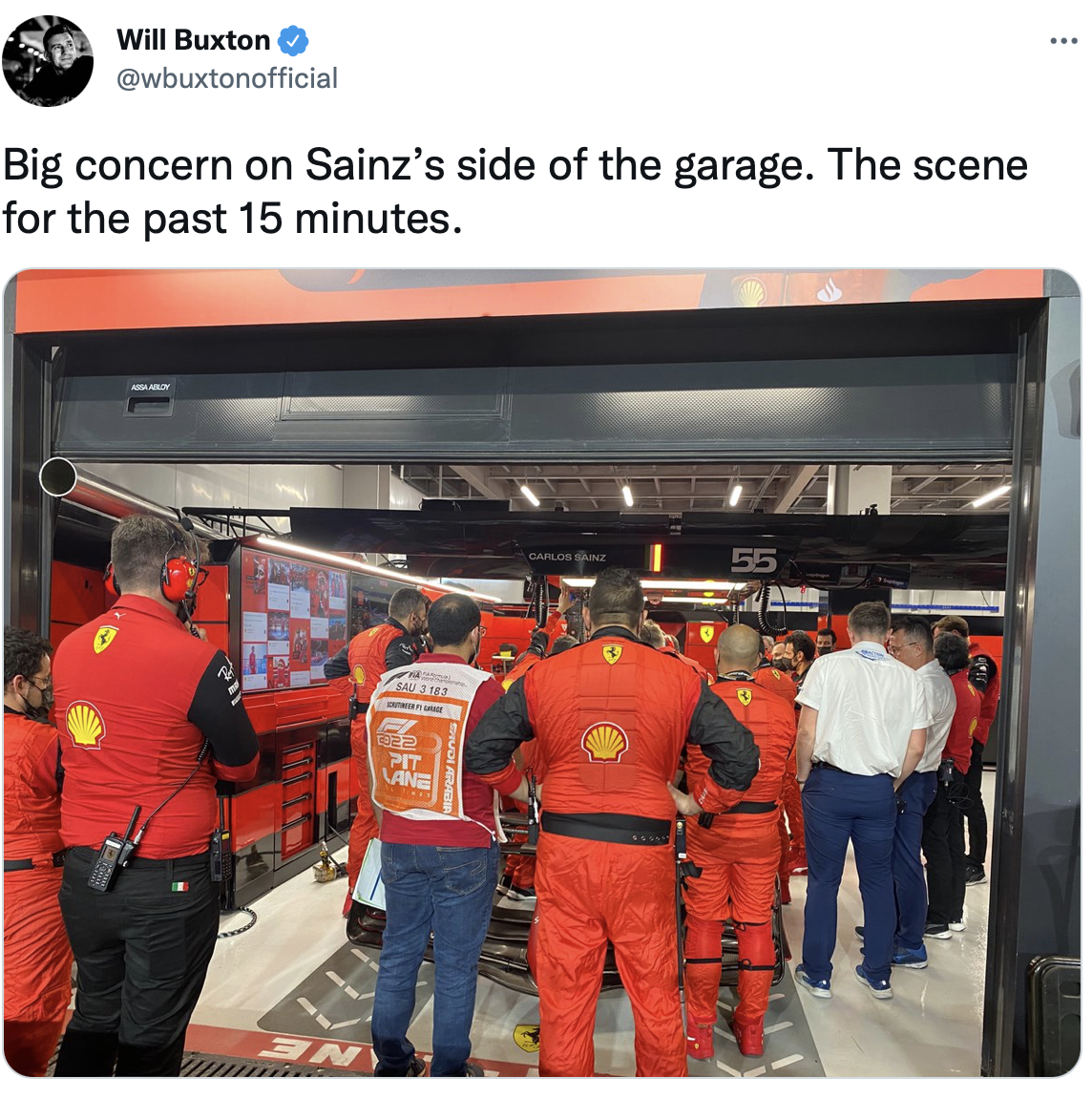 据F1记者报道,塞恩斯赛车遇到问题,车队正在FIA官员的监督下进行维修。