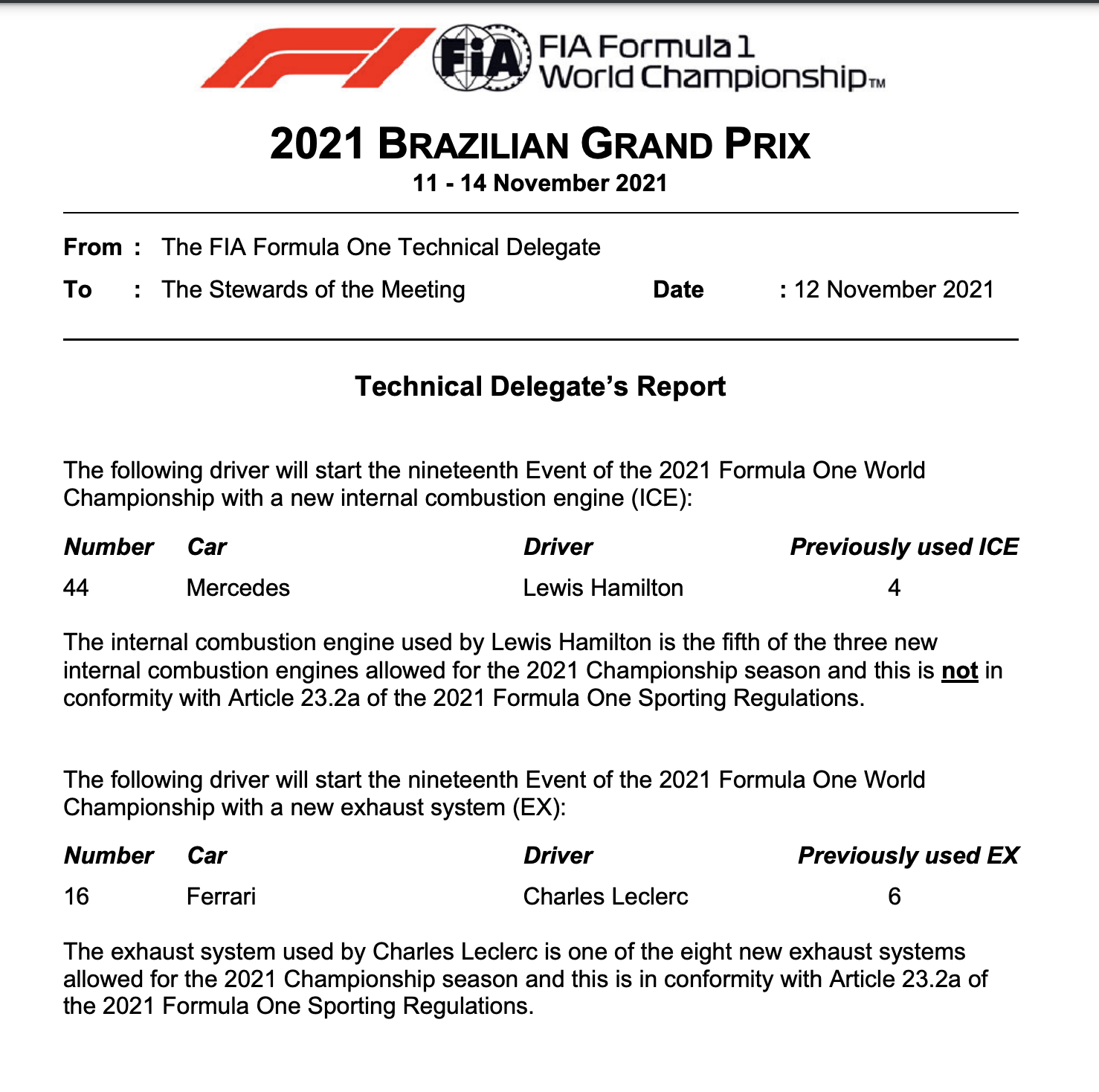 北京时间2021年11月12日,F1官方文件确认汉密尔顿因使用第5套内燃机(ICE),将在巴西站正赛被罚退5位发车。