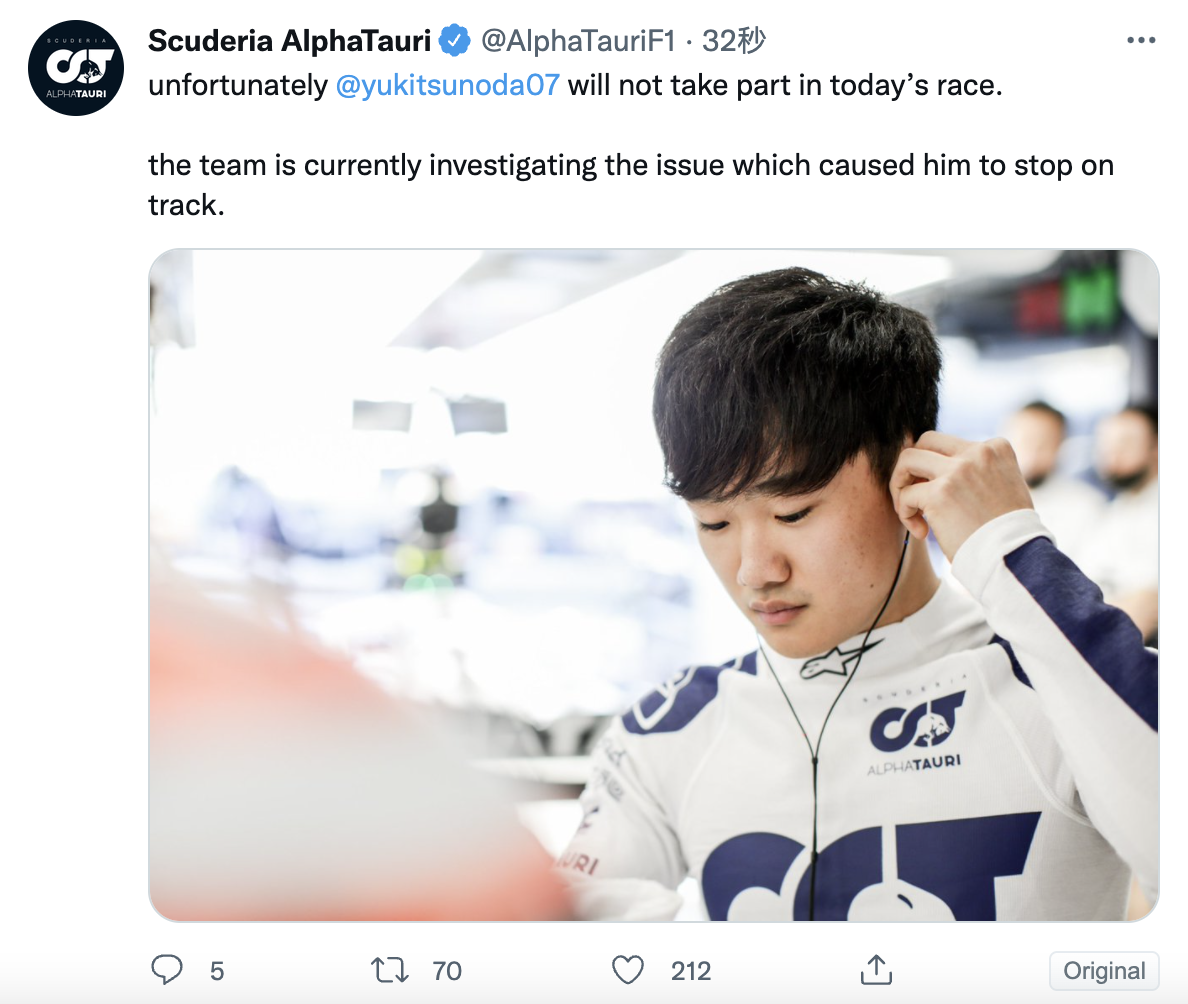 红牛二队官宣,角田赛车遇到问题,他将退出今天正赛。
