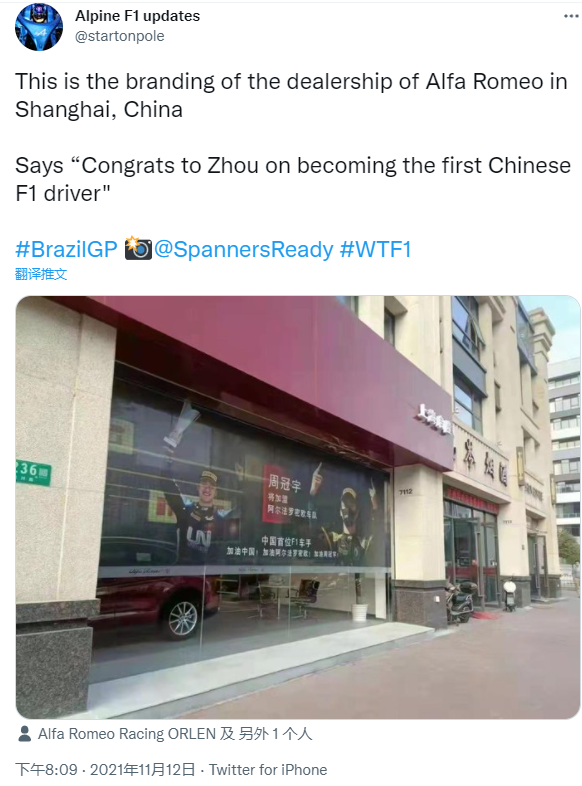 照片显示,在4S的橱窗已经有周冠宇大幅海报,并写上“周冠宇将加盟阿尔法罗密欧车队!中国首位F1车手!加油中国!加油阿尔法罗密欧!加油周冠宇!”