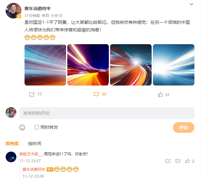 另外,腾讯体育F1解说何辛也发微博:“虽然国足1-1平了阿曼,让大家都比较郁闷。但我突然有种感觉:在另一个领域的中国人将很快为我们带来惊喜和振奋的消息!”