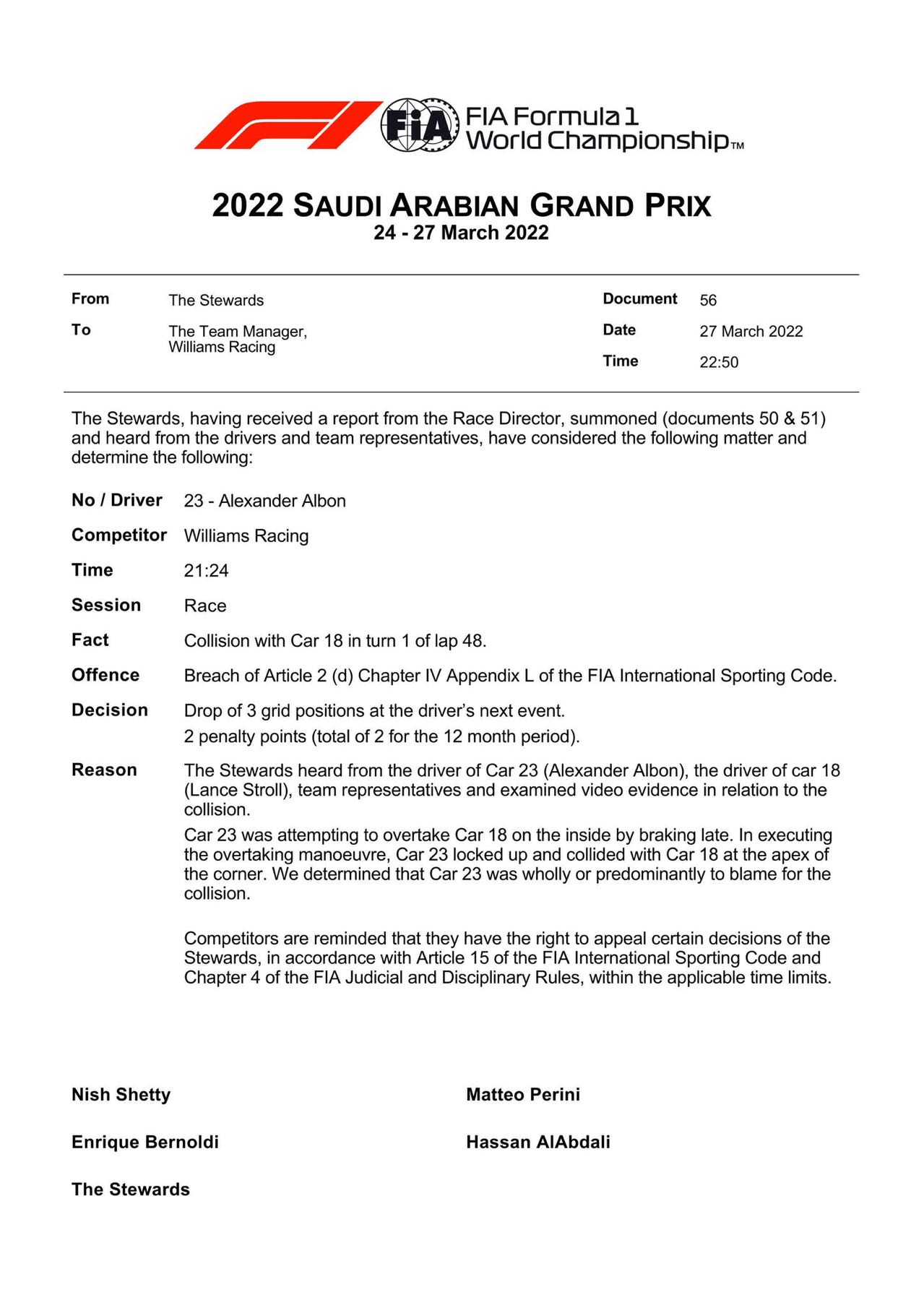 FIA发布通告,阿尔本由于在比赛中和斯托尔发生碰撞,下一站被罚退三位起步。