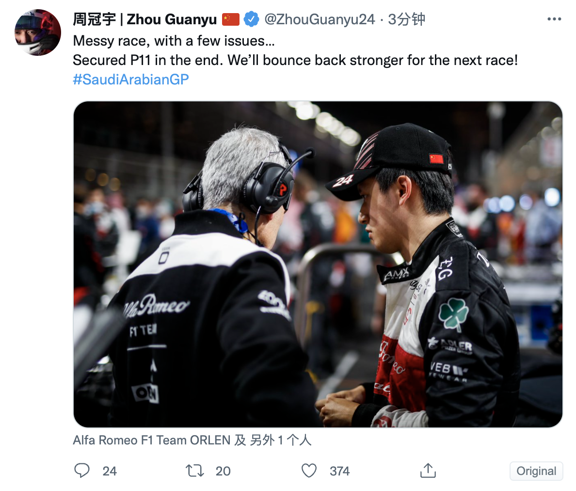 周冠宇赛后在社交媒体发文:混乱的比赛,还出现了一些问题。最终以11名完赛,下一站比赛我们会强势归来。