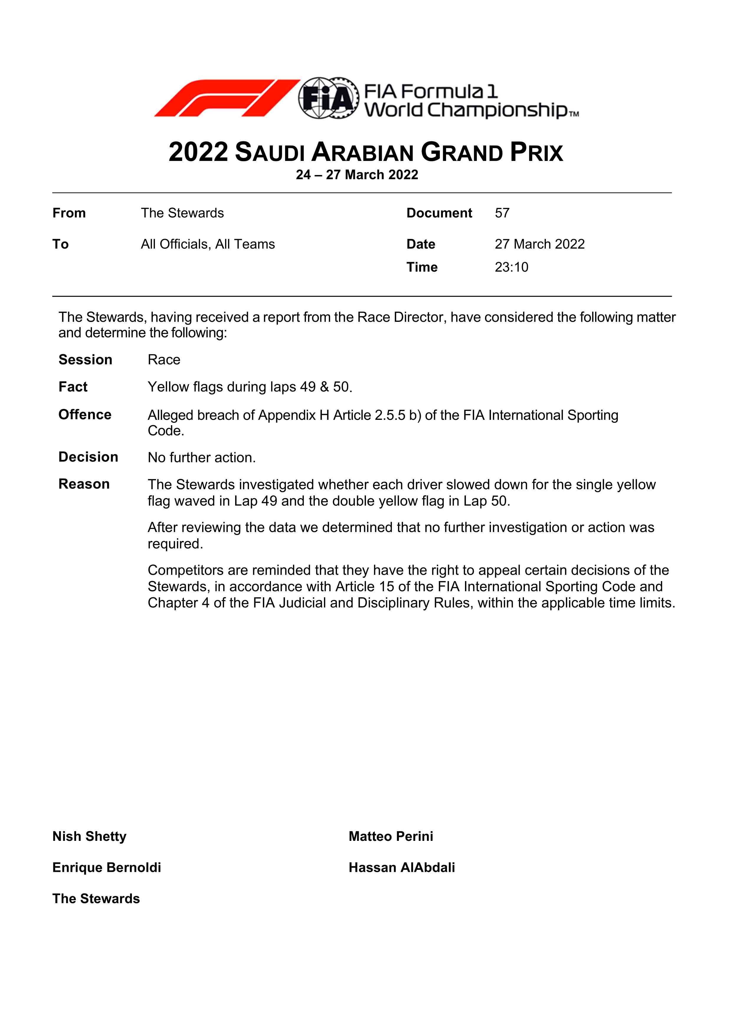 赛会回看了视频和数据,几位车手均遵守规则,在黄旗和双黄旗时减速,调查就此结束。