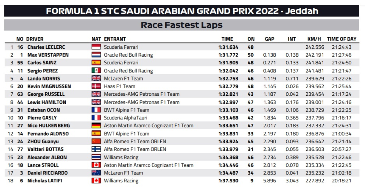 沙特大奖赛正赛所有选手个人最快圈