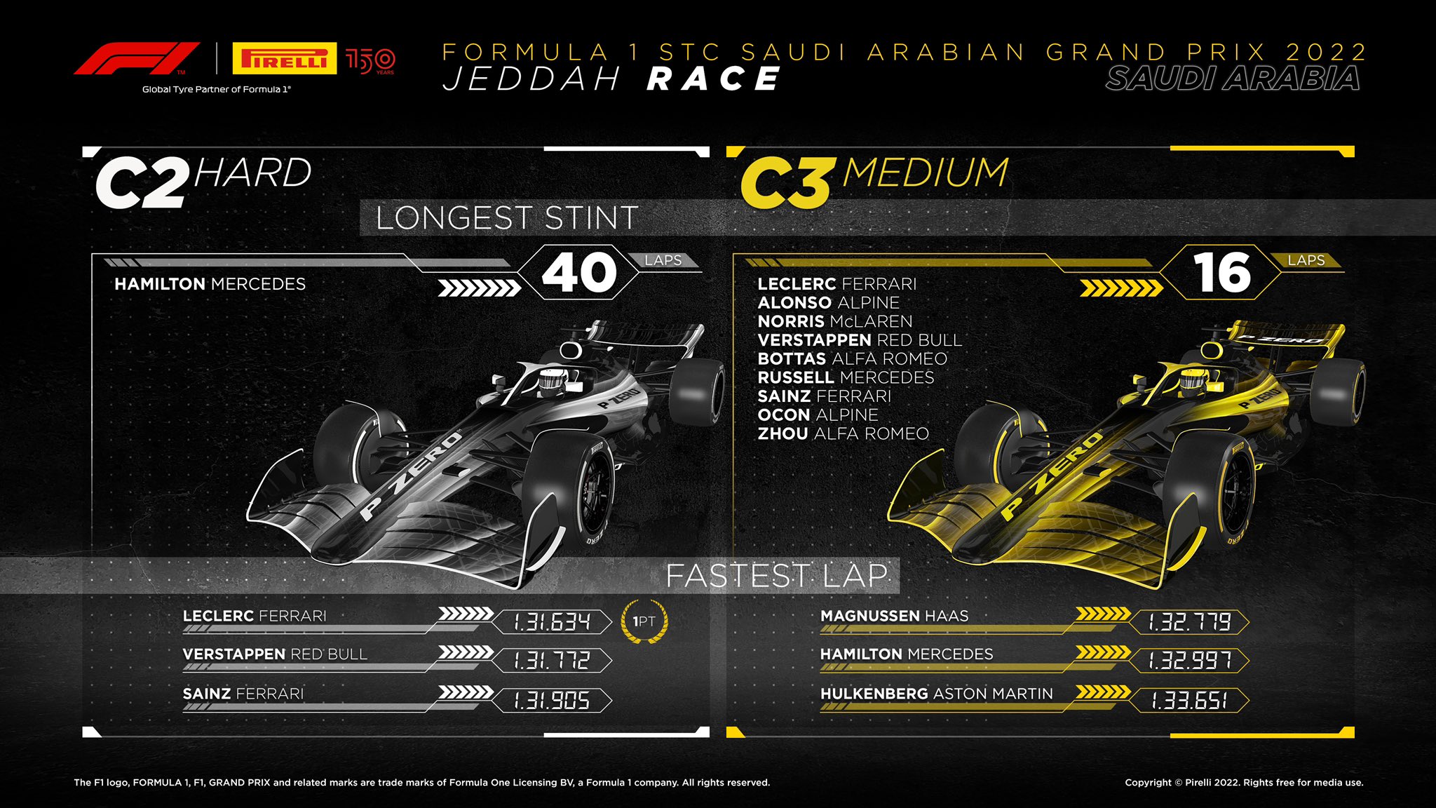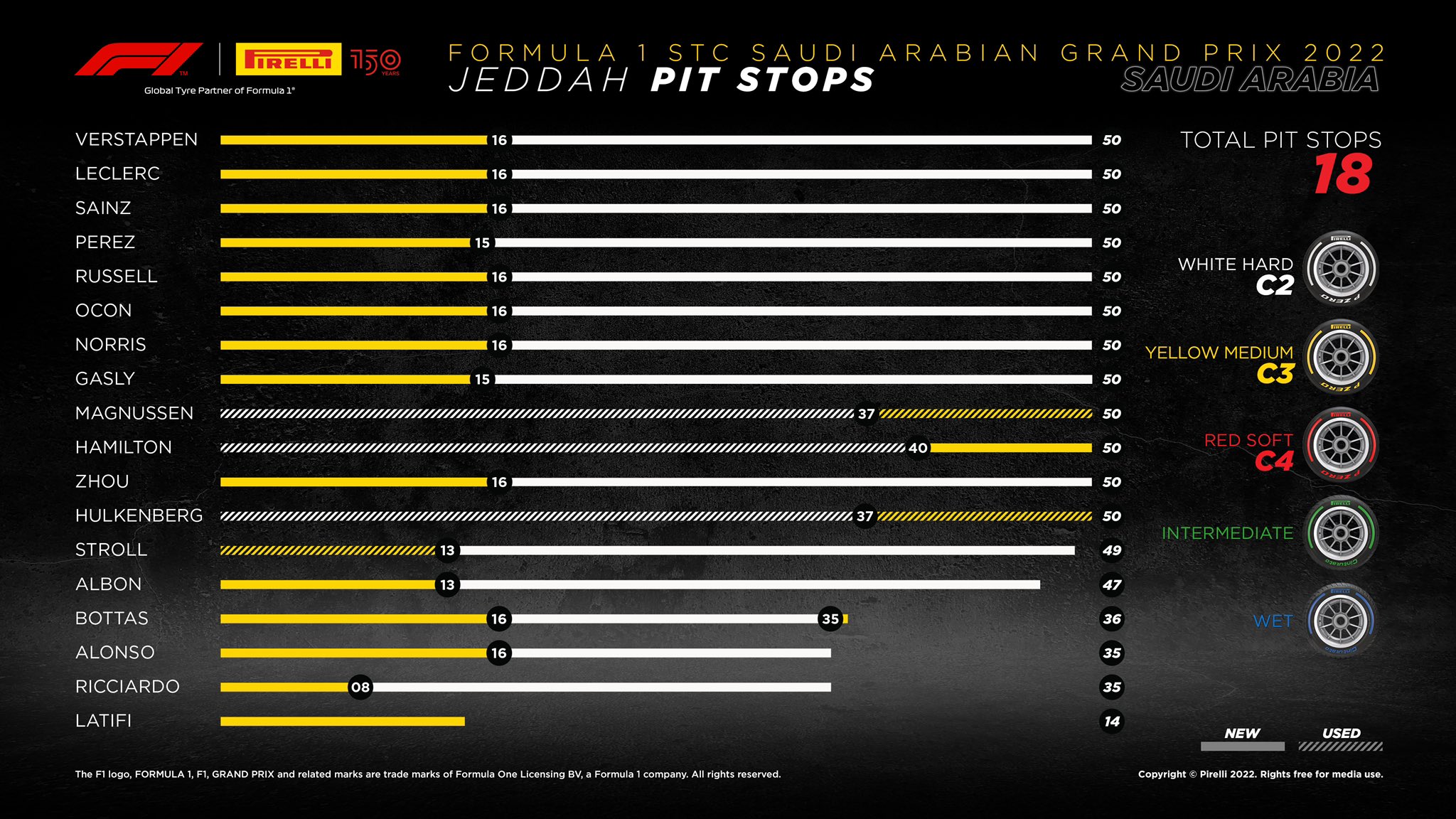 倍耐力官方推特发布了沙特大奖赛官方轮胎报告,汉密尔顿使用白胎跑了40圈的比赛,中国车手周冠宇在换上白胎后进行了34圈的里程。