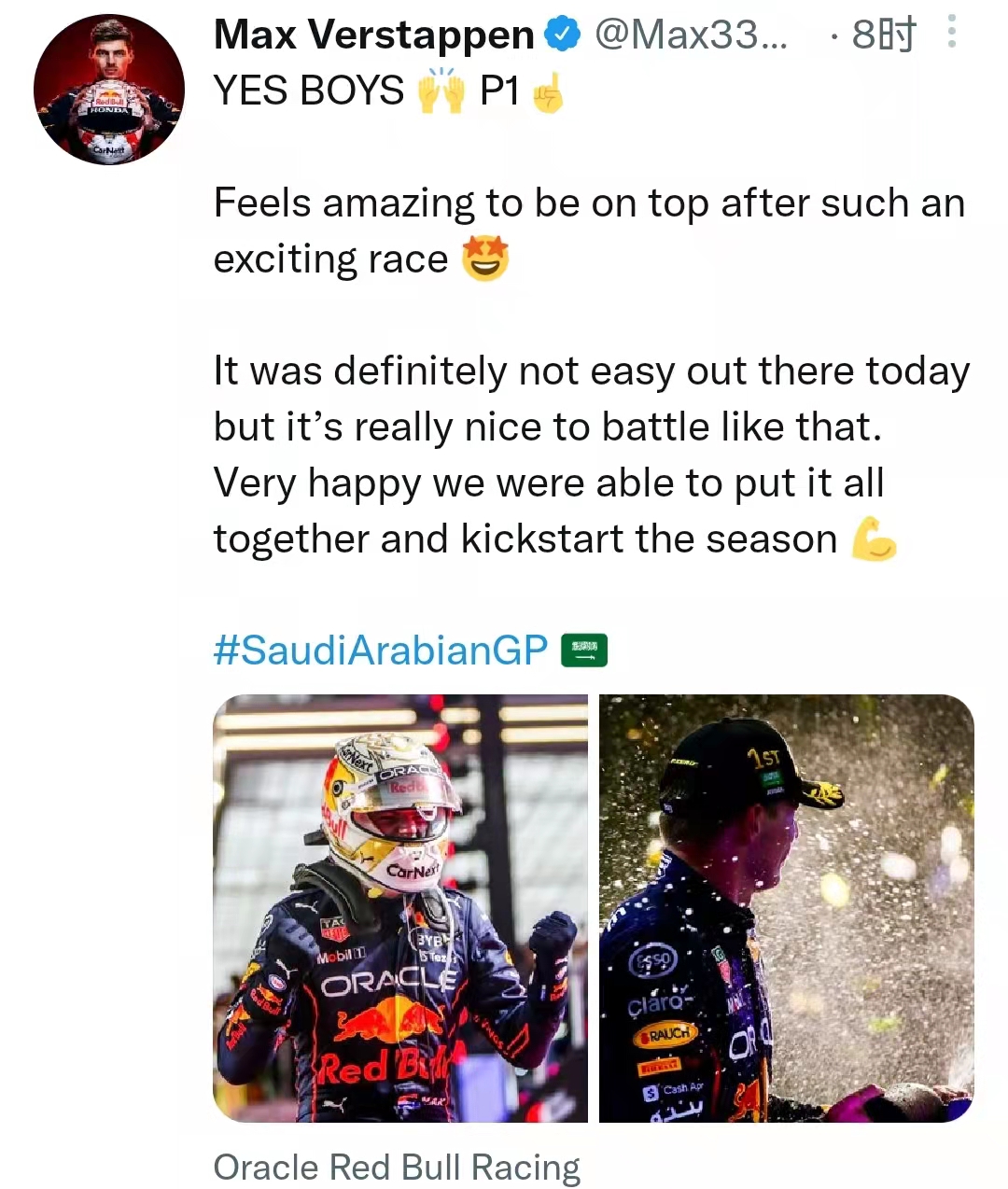 维斯塔潘发Twitter庆祝了他本赛季首个分冠!