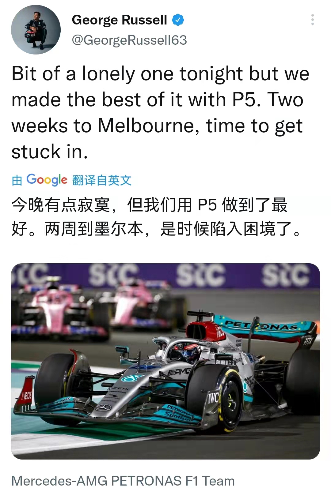 沙特站赛后,拉塞尔赛后发twitter表示:取得第五已经是最好的表现了。下一站澳大利亚站之前还有两周,我们要赶紧撸起袖子加油干了!