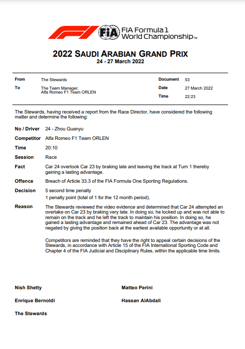 F1官方判罚:周冠宇出赛道获利,超级驾照扣1分