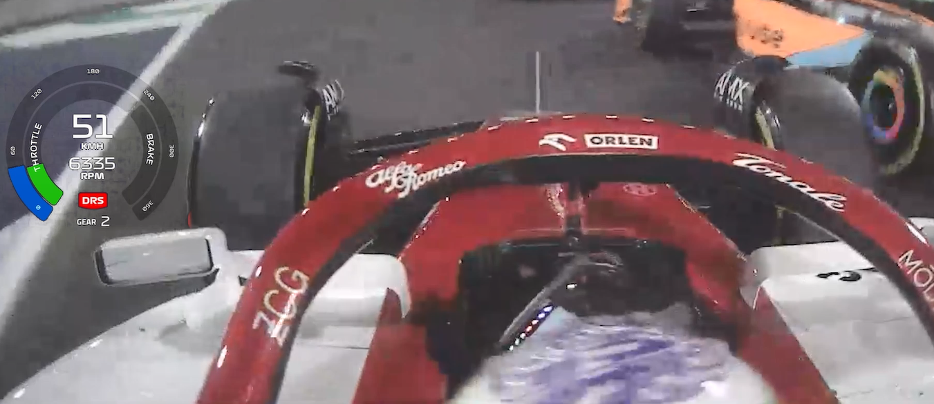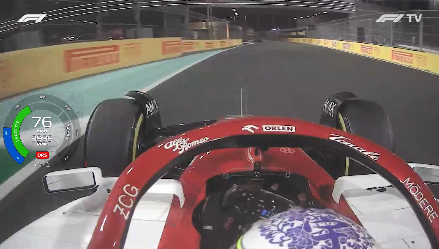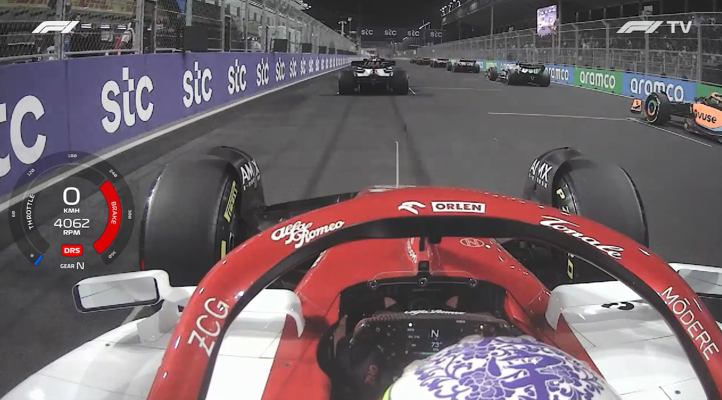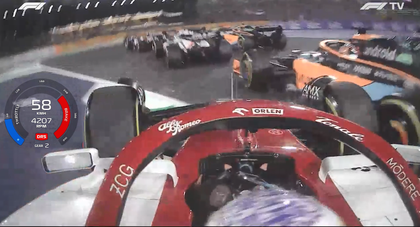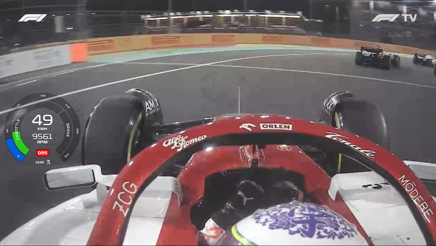 周冠宇温柔的起步(一如博塔斯)虽然稍慢但还算合格,但是1号弯继续加不起来速。