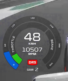 首先我们可以看到周冠宇进入1号弯,刹车,降档,5-4-3-2,此时迈凯伦在右边让他不得不让线,速度到了58,此时转速4207转。