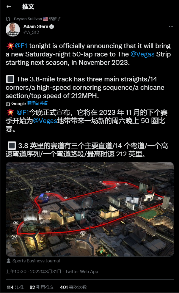 在F1官方宣布了拉斯维加斯大奖赛后,motorsports记者Adam Stern在他的个人推特上展示了更多的赛道细节。