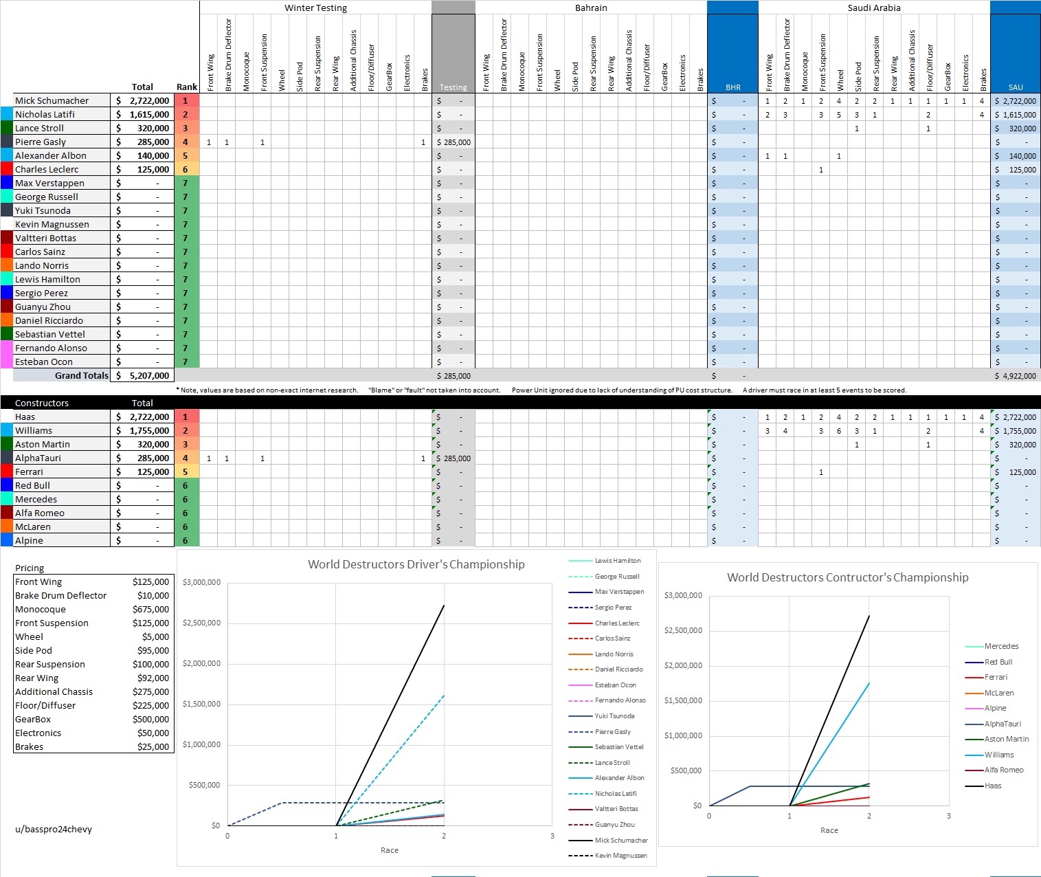 国外网友制作的新赛季“F1修车费用排行榜”来了。新赛季截止到沙特大奖赛,米克·舒马赫暂时登顶修车费用榜榜首。在沙特排位赛和正赛两度撞车的拉提菲目前暂列第二。