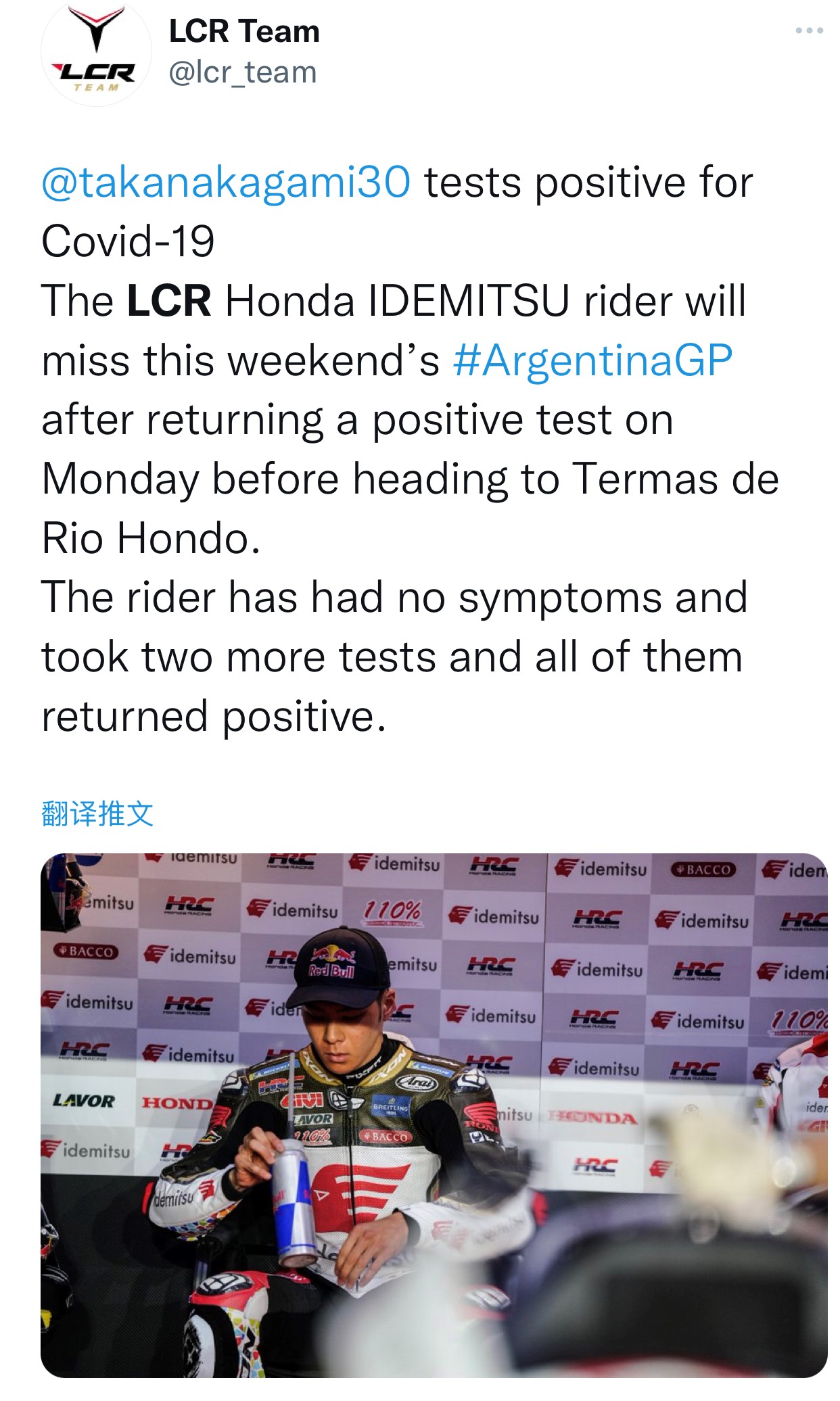 根据 LCR 的声明,中上贵晶在周一返回Termas de Rio Hondo赛道前新冠检测呈阳性,随后他又接受了两次检测,均为阳性,目前没有任何症状。