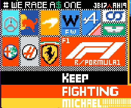 近日,在reddit热门涂鸦板块place下,F1车迷们将各支车队的LOGO绘制了上去,底下还有一句为舒马赫加油的“Keep fighting Michael”。