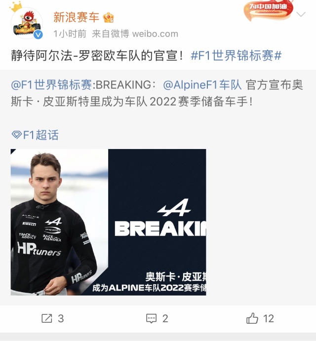 周冠宇的最大竞争对手,F2的皮亚斯特里官宣明年成为F1 Alpine储备车手之后,车迷更是兴奋至极。