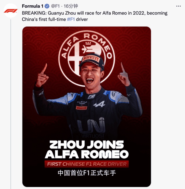【官宣】周冠宇成为中国F1首位正式车手,2022赛季加盟阿尔法罗密欧车队