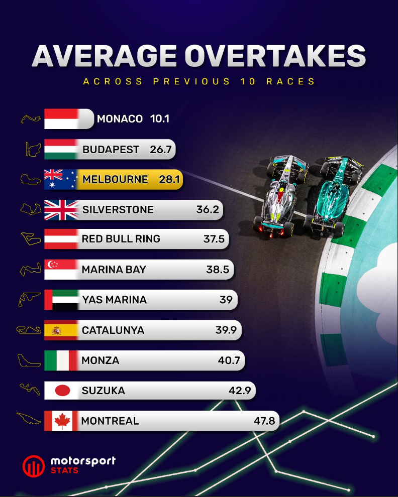 近日,Motorsports发布了近十年最难超车的十一条赛道平均每场比赛的超车次数。
