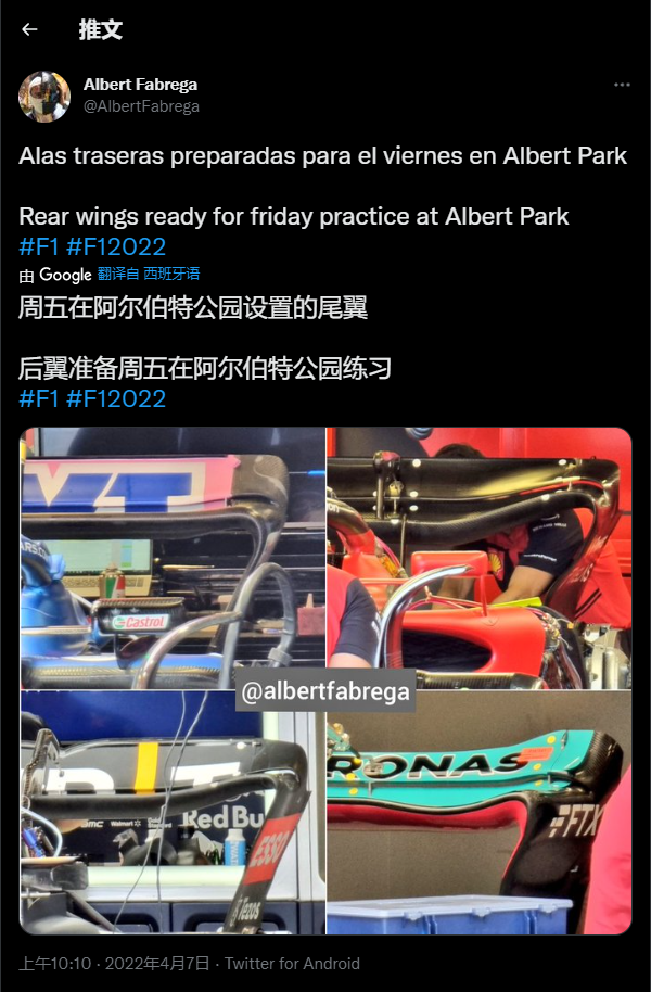 据F1记者AlbertFabrega个人推特,更新了Alpine、红牛、法拉利以及梅赛德斯为周五练习赛准备的尾翼。