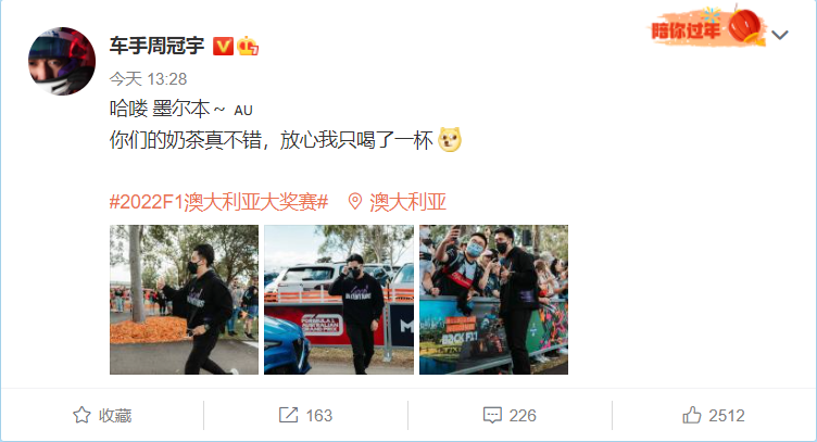 周冠宇po图:奶茶只喝了一杯