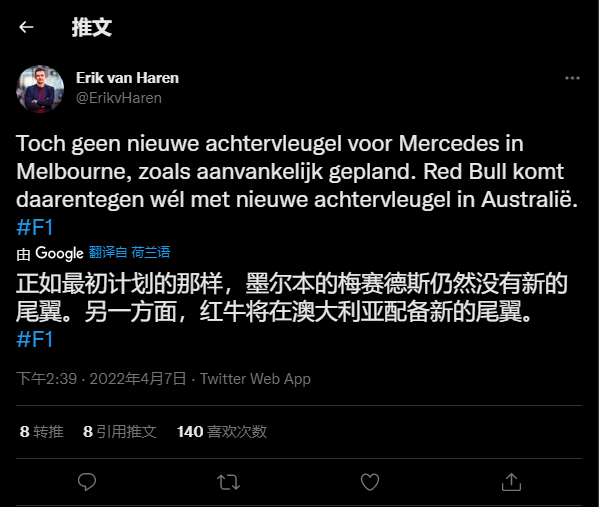 据荷兰记者Erik van Haren个人推特更新,梅赛德斯本场比赛并没有带来新款尾翼,而红牛则是带来了升级款尾翼。