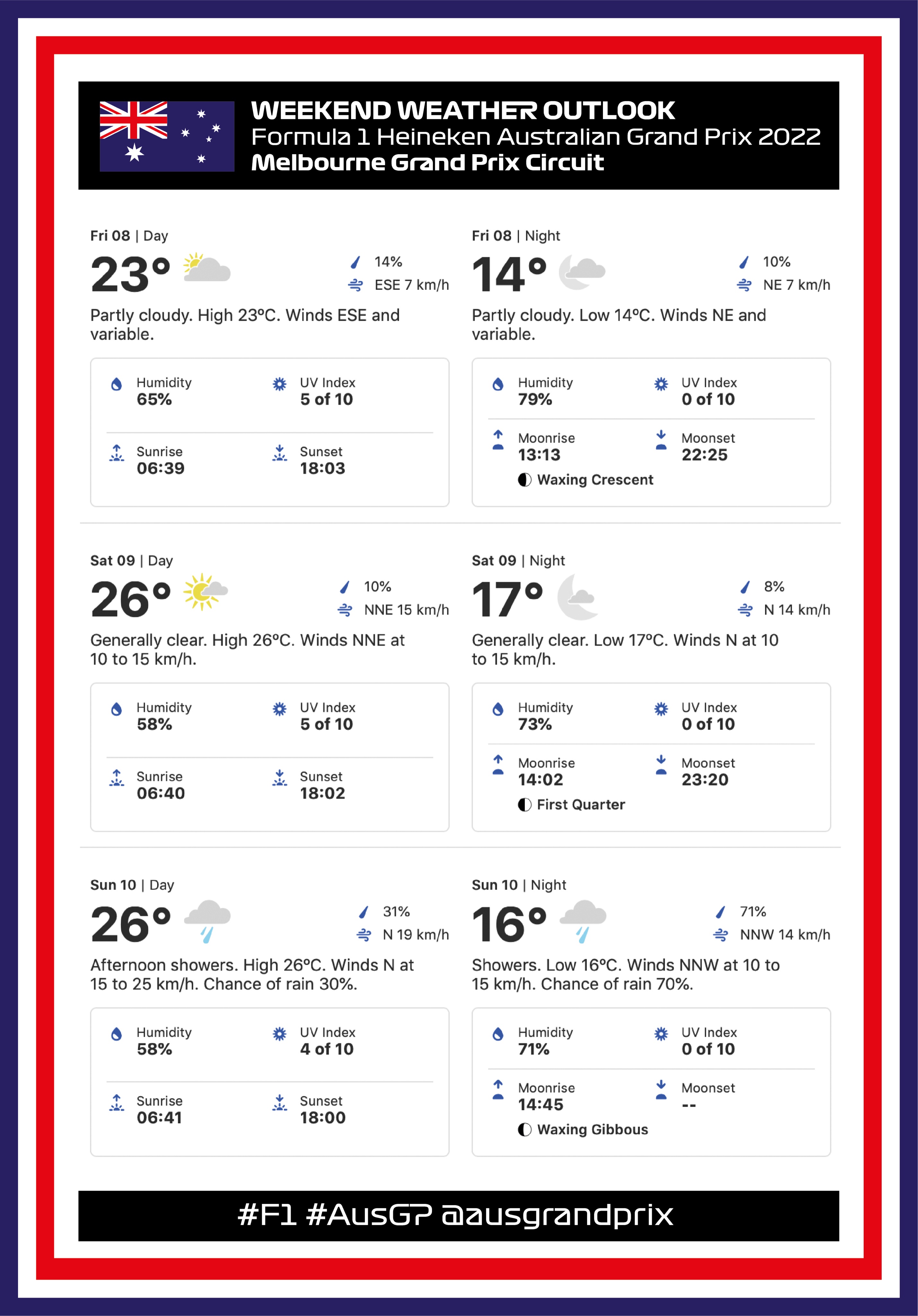 根据官方发布的天气信息,本周末的墨尔本大奖赛上,大部分时间将以干燥和多云为主;气温在排位赛时将升至26度;而到了周日,官方预测可能会出现降雨,虽然周日夜间到周一凌晨降雨概率较大,但周日中午依然有可能出现零星降雨。因此官方预测,正赛将以干地发车,但随着比赛进行出现降雨。