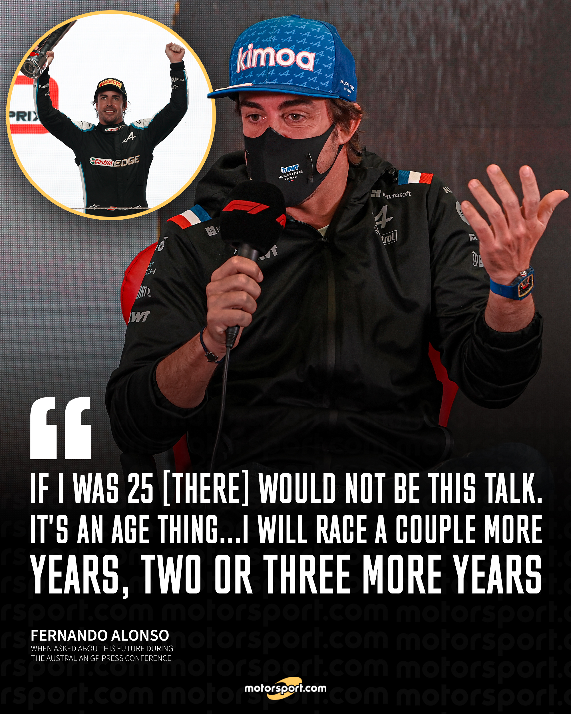 在澳大利亚大奖赛练习赛前采访时,被问到还要继续开几年,阿隆索表示:“如果现在我25岁,就不会有诸如此类的问题了,我会继续再开几年的,也许是两年也许是三年”